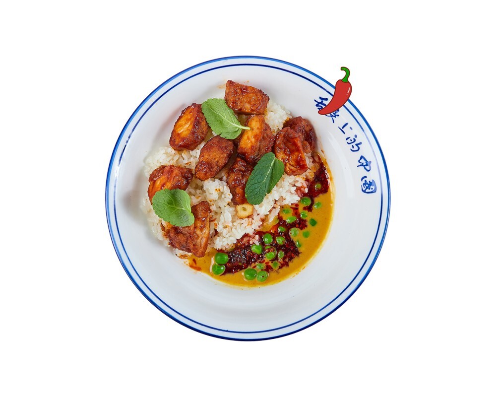 Зеленый горошек, курица, кисло-сладкий соус, хлопья чили, чеснок, соус "Желтый карри"