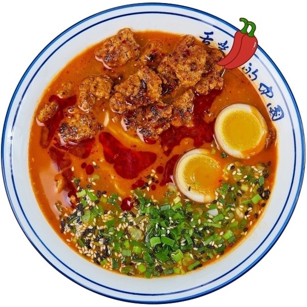 Фирменный бульон, лапша яичная, яйцо,рубленная курица, зеленый лук, кунжут, хлопья чили.