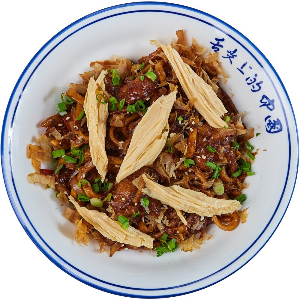 Соус "БлекБин, микс овощей,удон, зеленый лук,кунжут,соевая спаржа,стружка тунца.курица