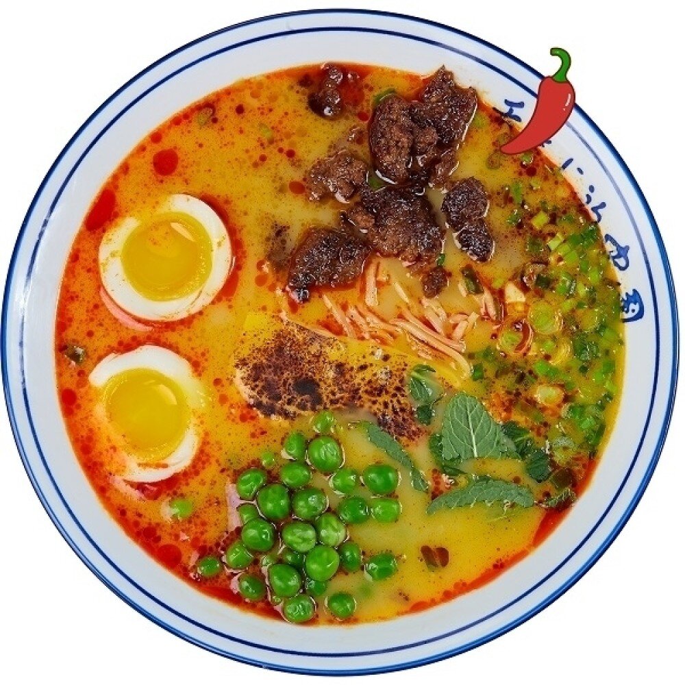 Фирменный сырный бульон, зеленый горошек, зеленый лук, лапша, сыр "Чеддер", яйцо маринованное, хлопья чили в масле, кунжут.