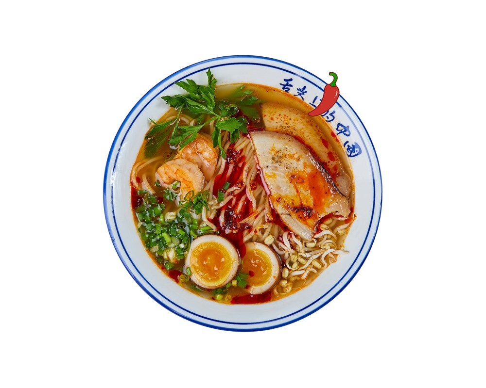 Фирменный бульон, яйцо, индейка, лапша, креветка, лук зеленый, кинза, соевые ростки.