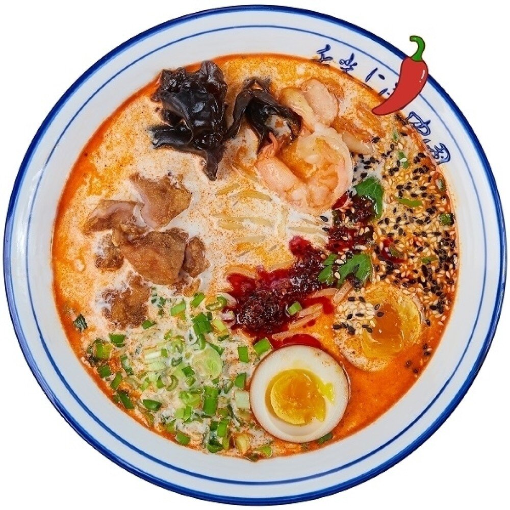 Фирменный бульон, яйцо, лапша, креветка, курица, древесные грибы, лук зеленый, кинза, кунжут, хлопья чили.