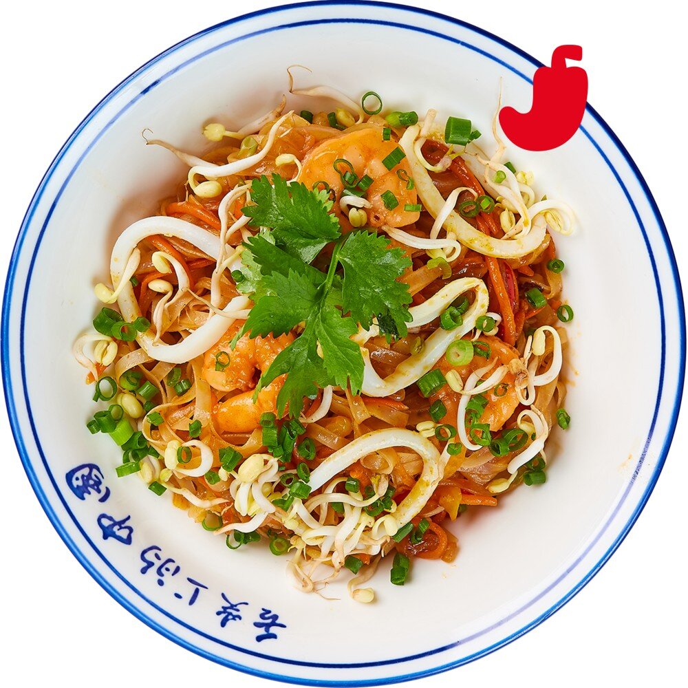 Кальмар, креветка, рисовая лапша, соус "Пад Тай", соевые ростки, кинза, лук зеленый,арахис, микс овощей.