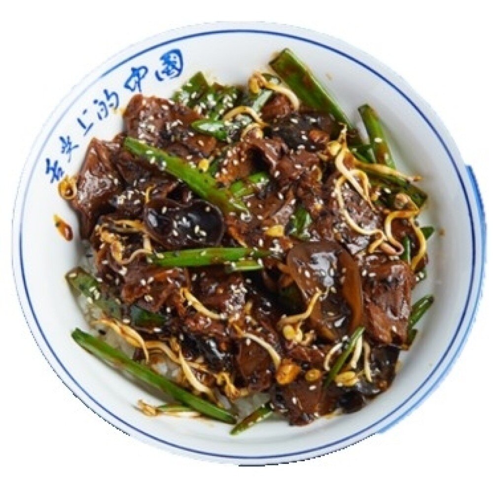 паровой рис, древесные грибы, бычье сердце, соевые ростки, зеленый лук, соус "ХейХудзяо"