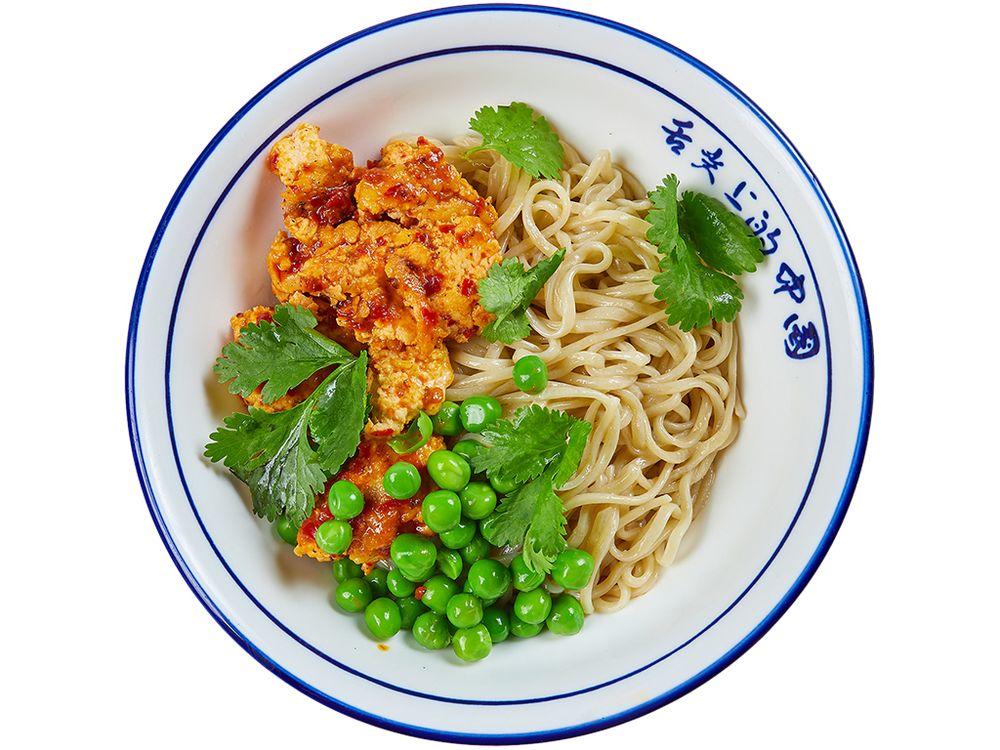 Яичная лапша, рубленная курица, соус "Тан тамен", зеленый лук, кинза, зеленый горошек.