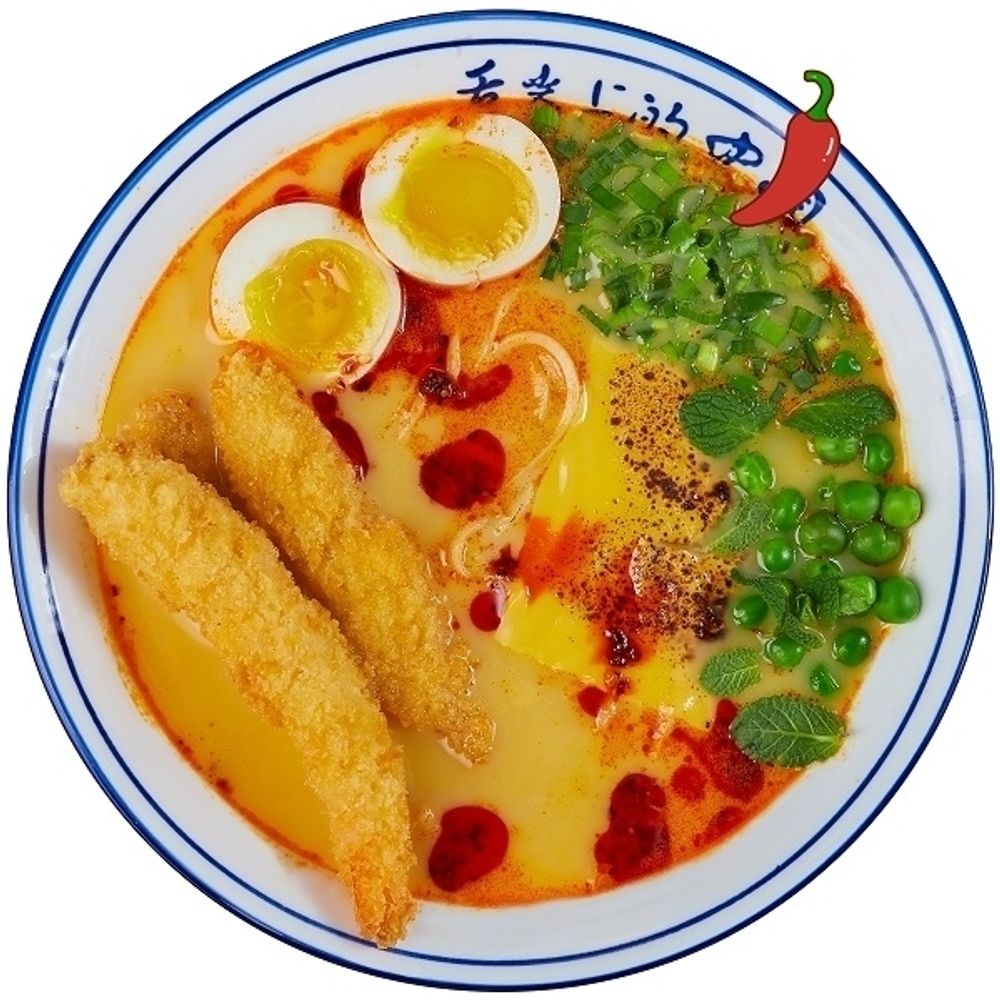 Фирменный сырный бульон, зеленый горошек, зеленый лук, лапша, сыр "Чеддер", яйцо маринованное, хлопья чили в масле, кунжут.