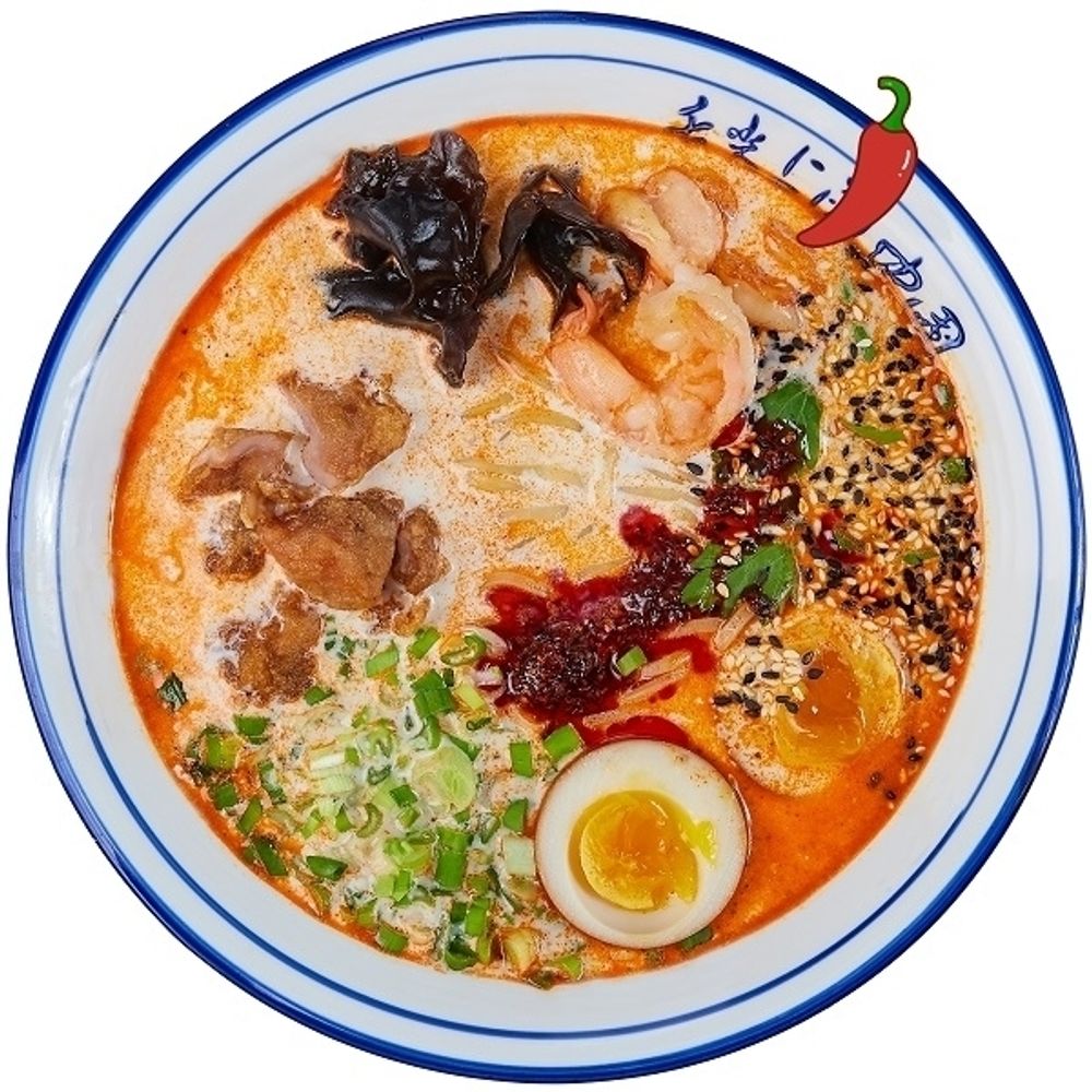Фирменный бульон, яйцо, лапша, креветка, курица, древесные грибы, лук зеленый, кинза, кунжут, хлопья чили.