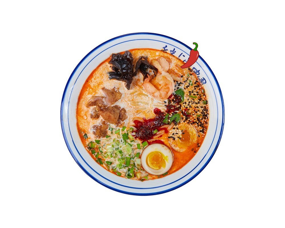 Фирменный бульон, яйцо, лапша, креветка, курица, древесные грибы, лук зеленый, кинза, кунжут, хлопья чили.