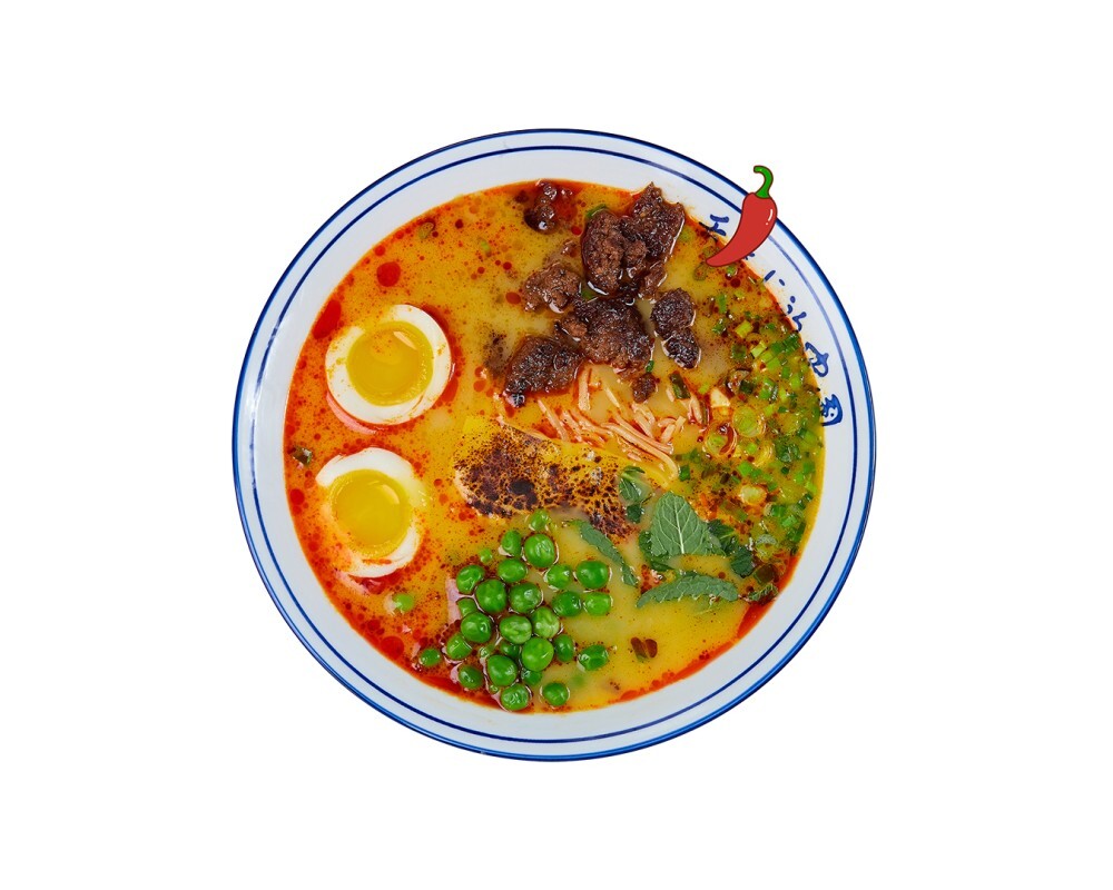 Фирменный сырный бульон, зеленый горошек, зеленый лук, лапша, сыр "Чеддер", яйцо маринованное, хлопья чили в масле, кунжут.